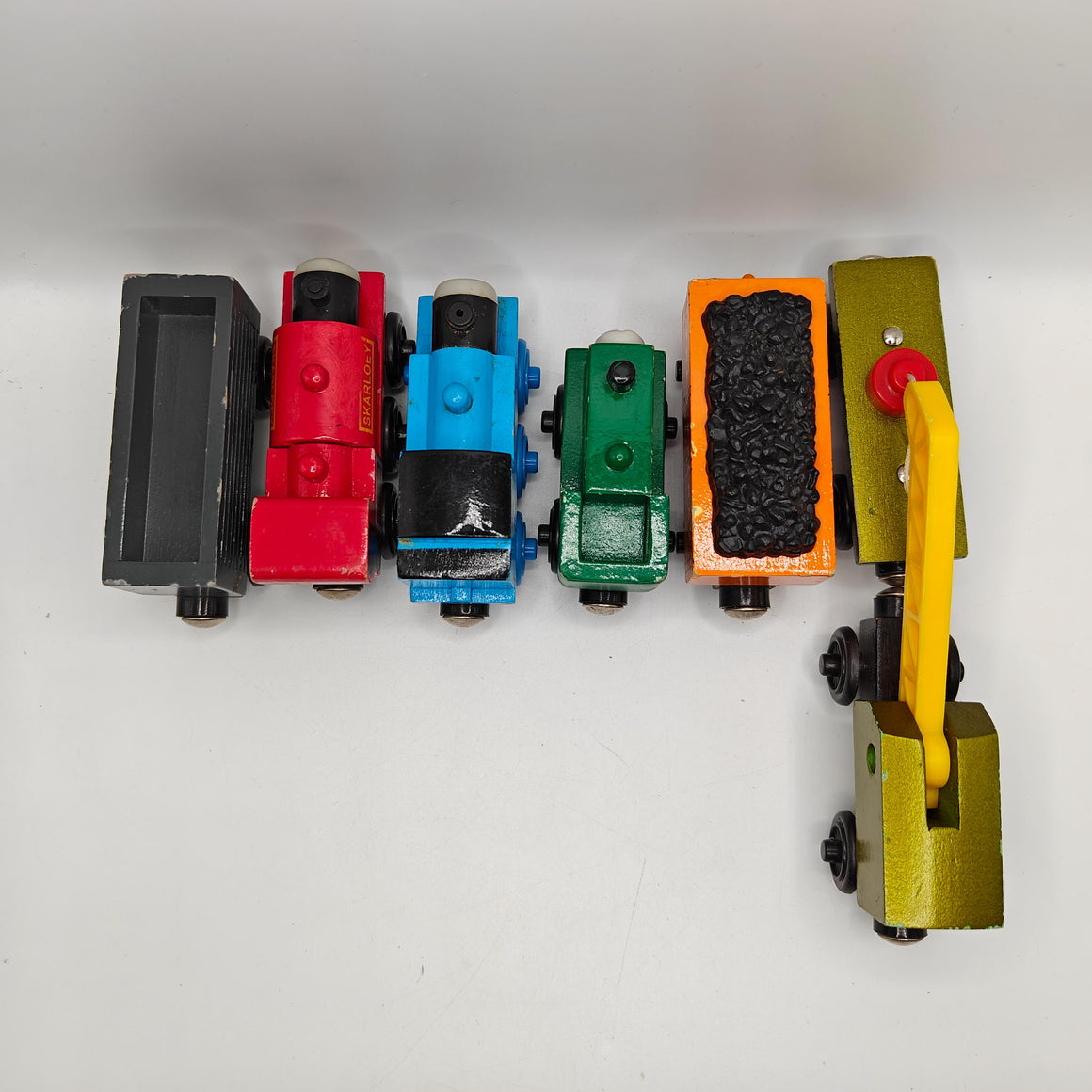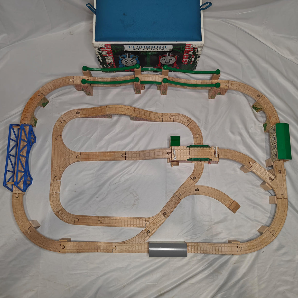 This item is in great used condition and comes with all parts. This is the Bridge and Tunnel Set from 2001 with the original Clickity Clack track. This set includes the characters Thomas, Skarloey, Neil, Fred, stand-in Topham Hatt and Conductor. This set also includes a Troublesome Truck and the Breakdown Train. Locations such as the Sodor Bay Bridge, the Suspension Bridge, the arched stone bridge, the arched viaduct, the Tidmouth Covered Bridge, and a lifting bridge. This is a fully featured set that also comes with the original Elsbridge Station storage bin with a cushion lid. This is a great set for any collector or getting started with Thomas toys.