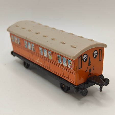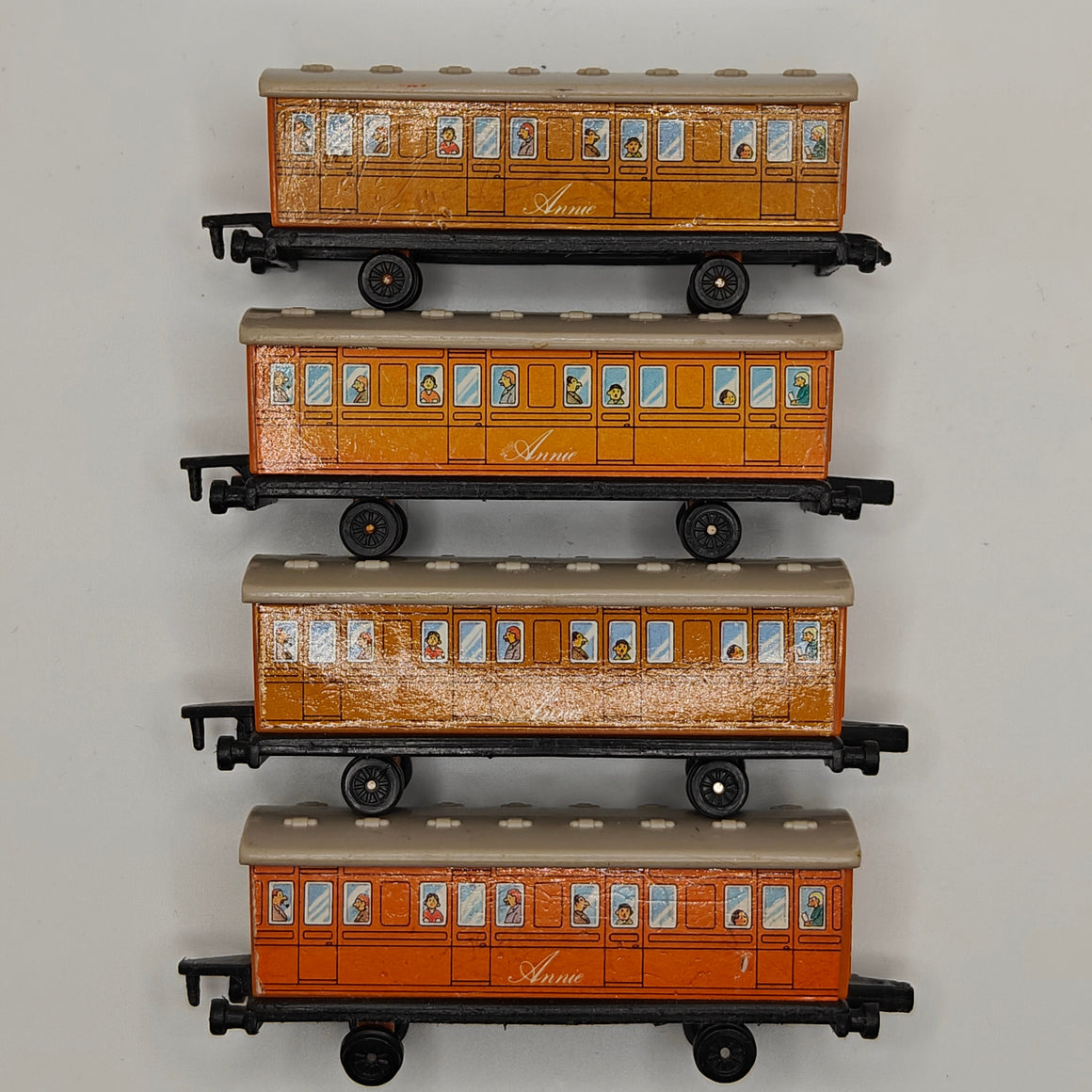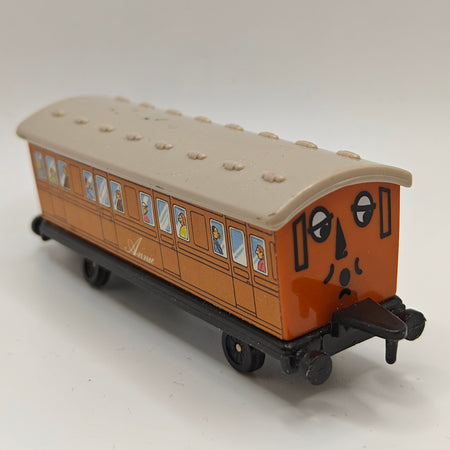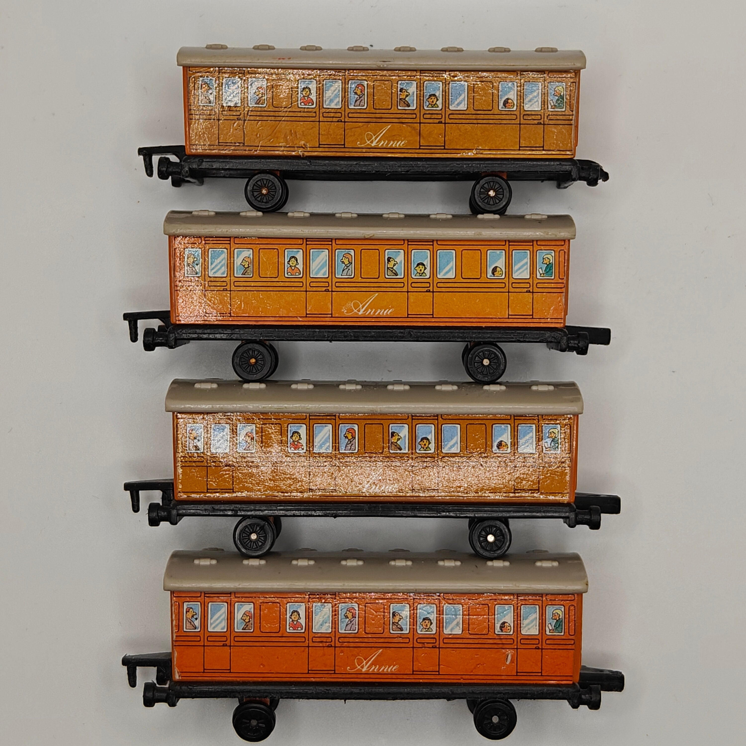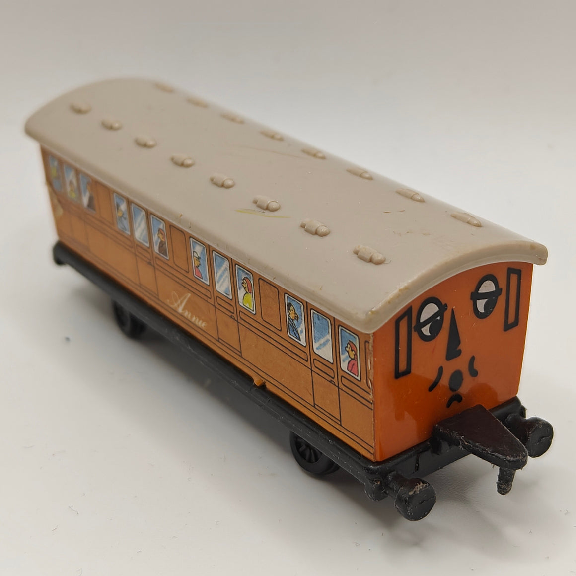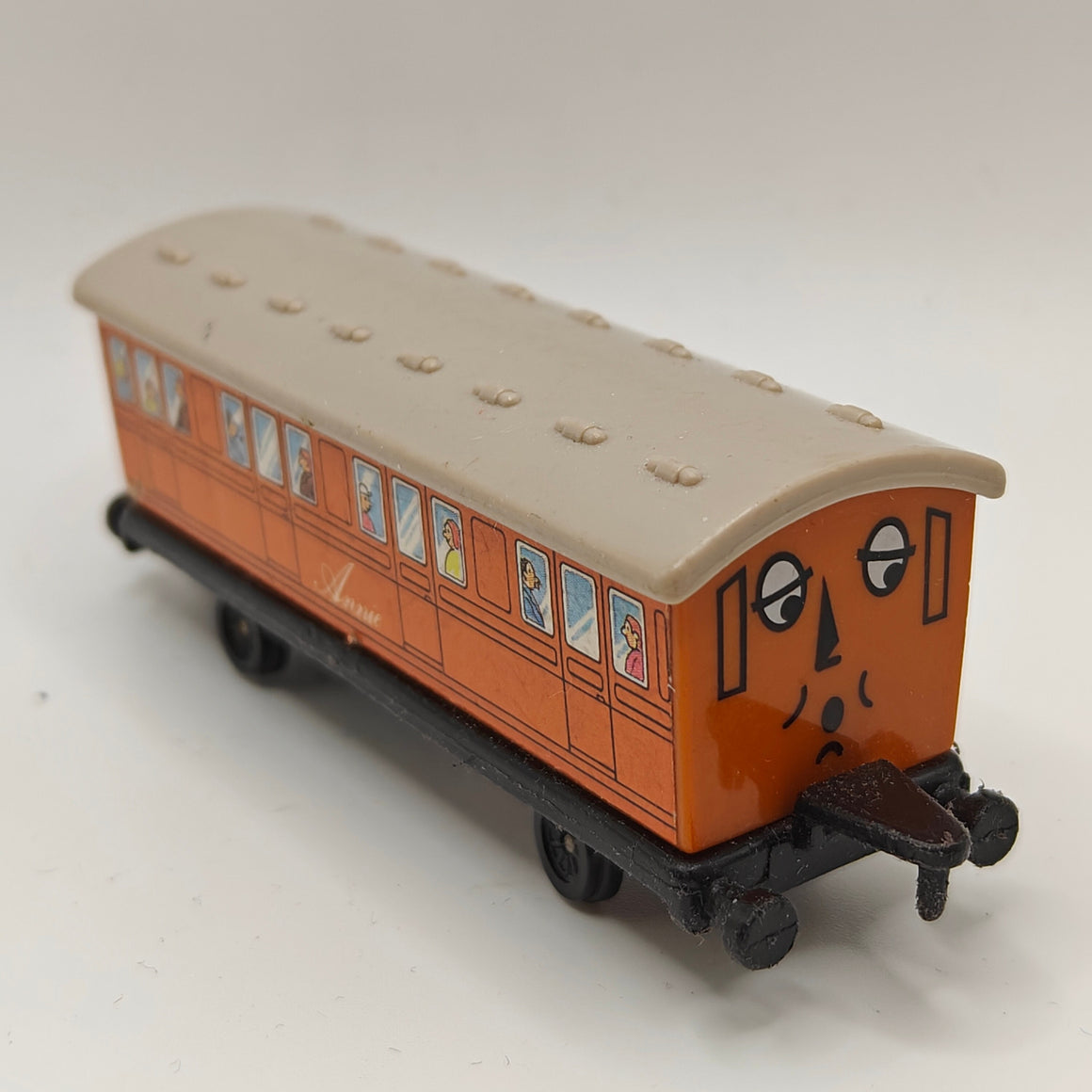 This listing is for the Thomas & Friends ERTL Diecast range's Annie. Released in the UK initially in 1985, this line featured 1/64 scale die-cast models and playsets based off of the characters from The Railway Series and its television counterpart. Many characters that were trains, cars, tenders, helicopters and even people were miniaturized and became collectible items as well as toys. Since being discontinued in 2004, the interest in these has only increased, with some characters becoming increasingly hard to find, albeit in good condition.