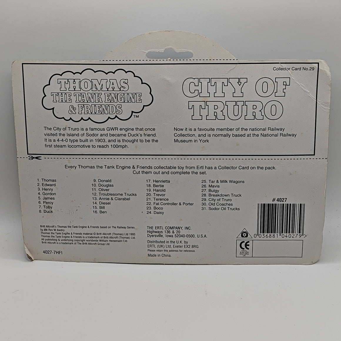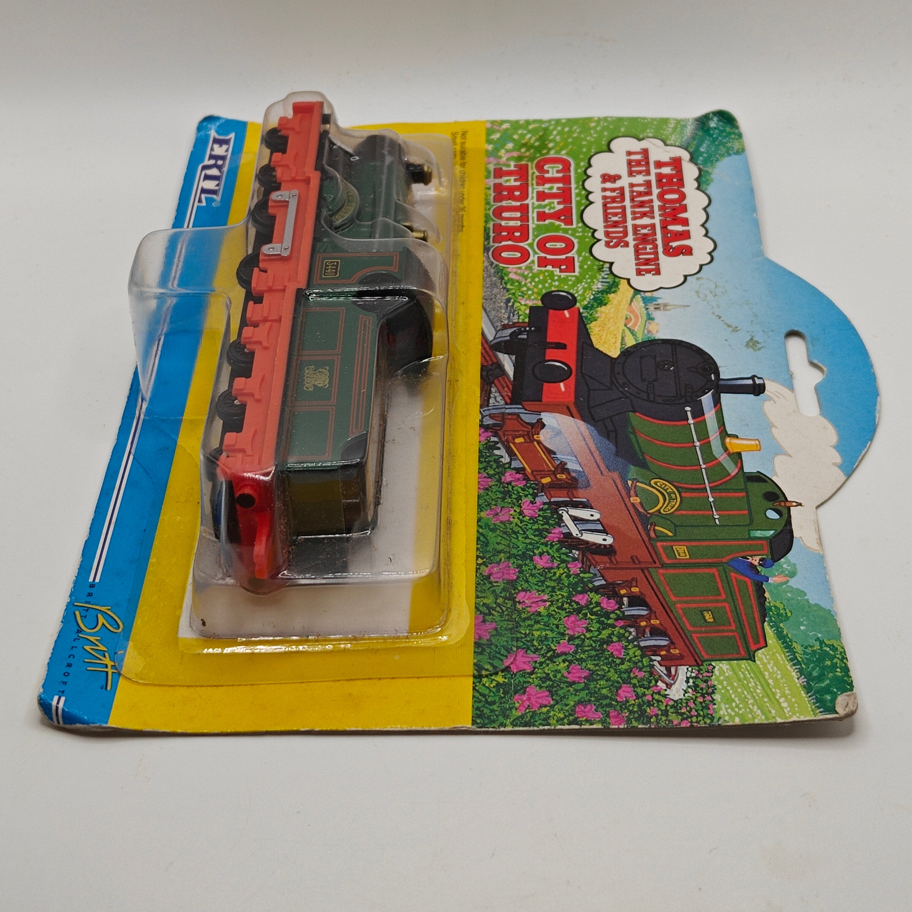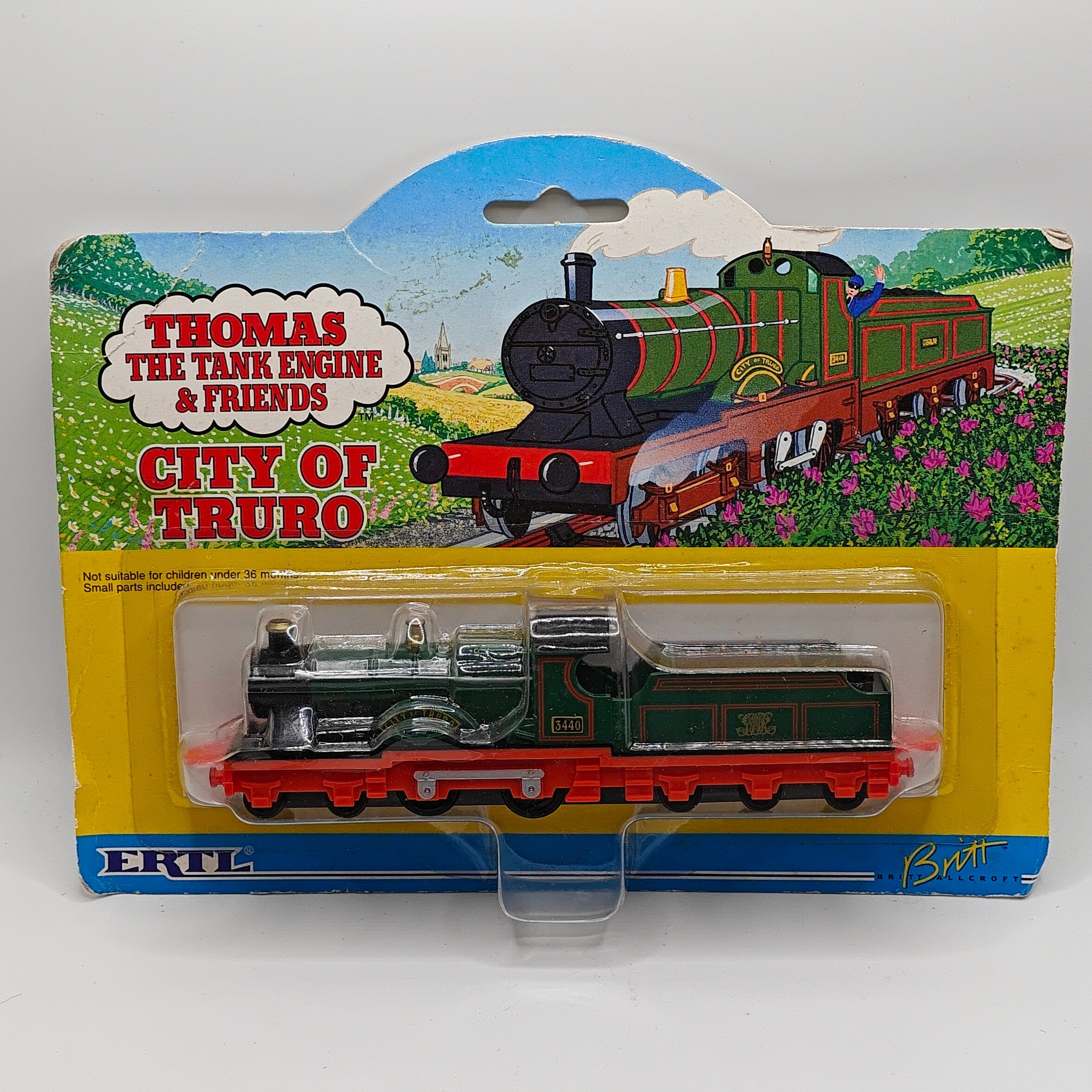This listing is for the Thomas & Friends ERTL Diecast range's City of Truro, new in box. Released in the UK initially in 1985, this line featured 1/64 scale die-cast models and playsets based off of the characters from The Railway Series and its television counterpart. Many characters that were trains, cars, tenders, helicopters and even people were miniaturized and became collectible items as well as toys. Since being discontinued in 2004, the interest in these has only increased, with some characters becoming increasingly hard to find, albeit in good condition.
