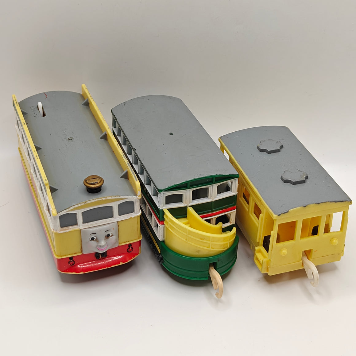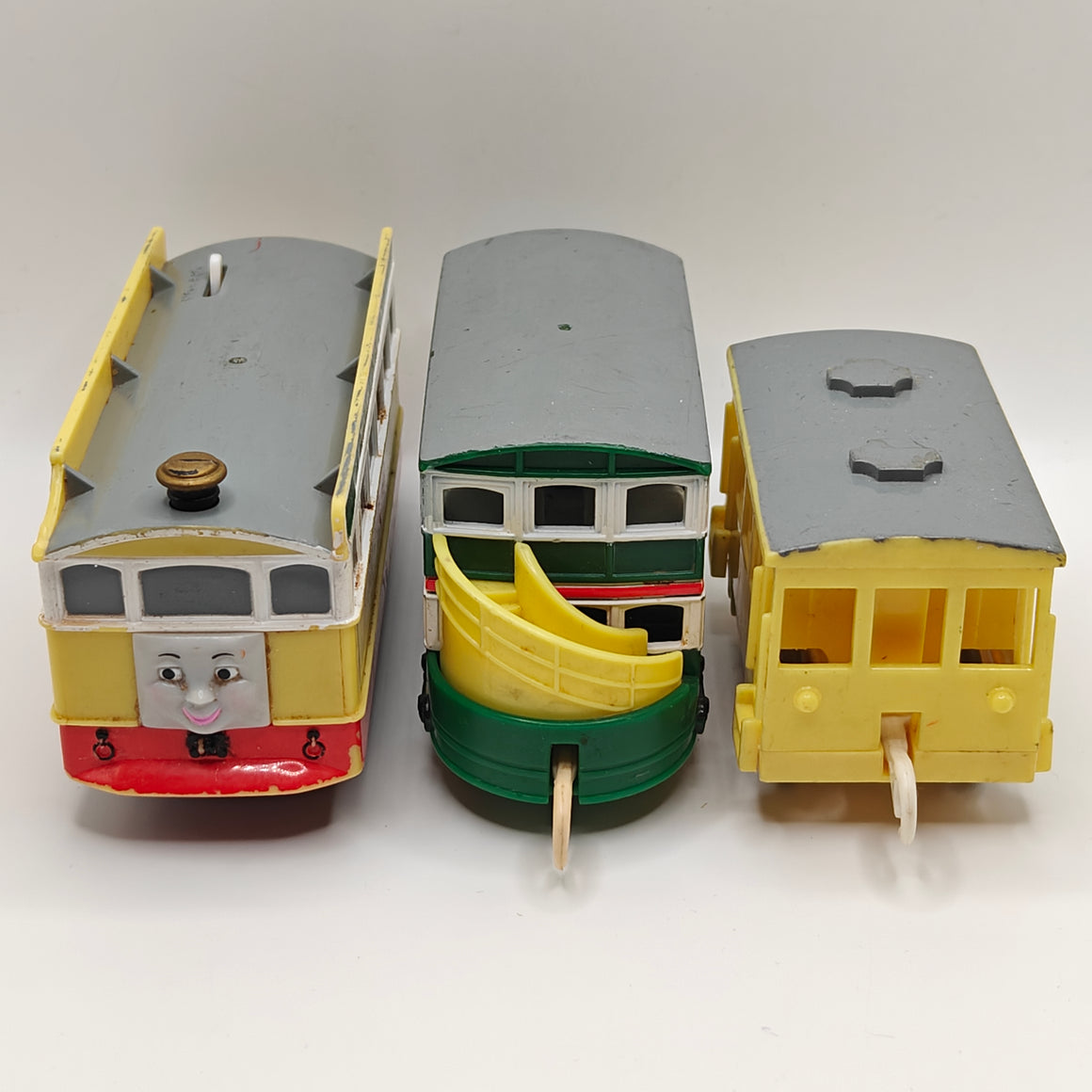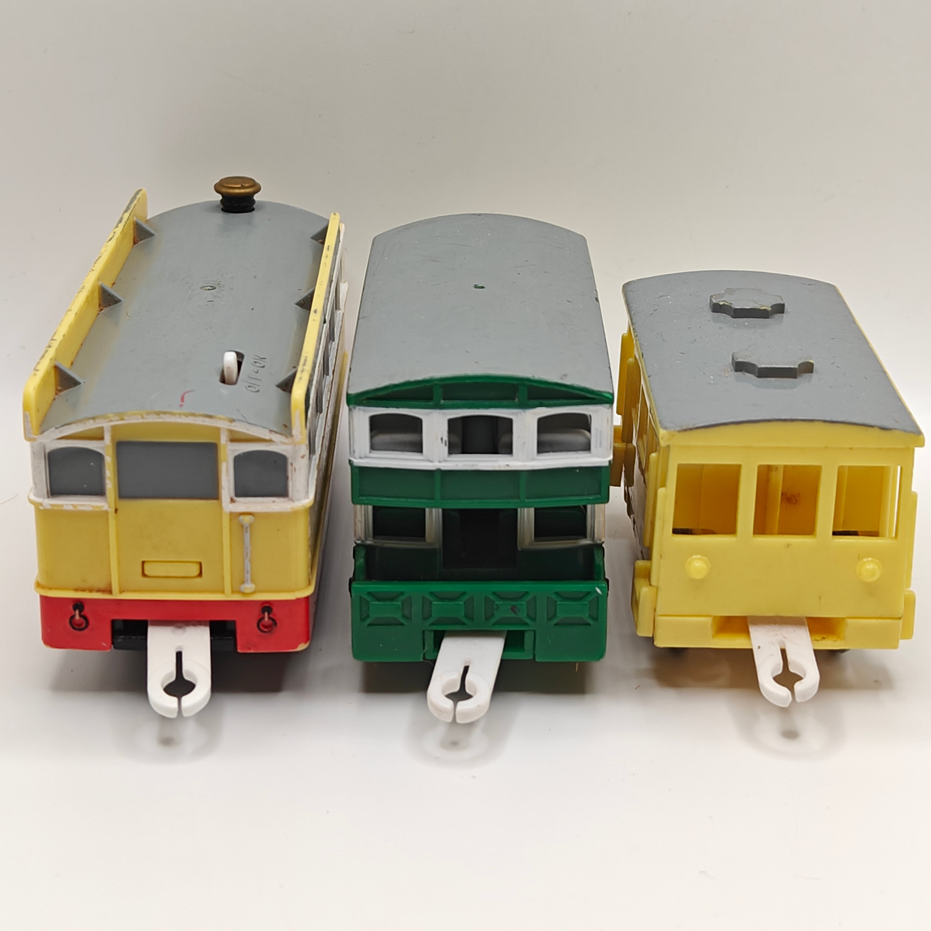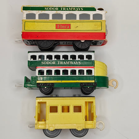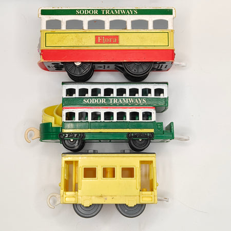 This is a complete Flora! She come's with her Sodor Tramways coach, as well as a yellow and grey caboose. Please note that she is missing a part of her casing at the very top as seen in the photos. Otherwise, this item has been disassembled, cleaned, repaired and tested for full functionality, it is ready for a new owner.