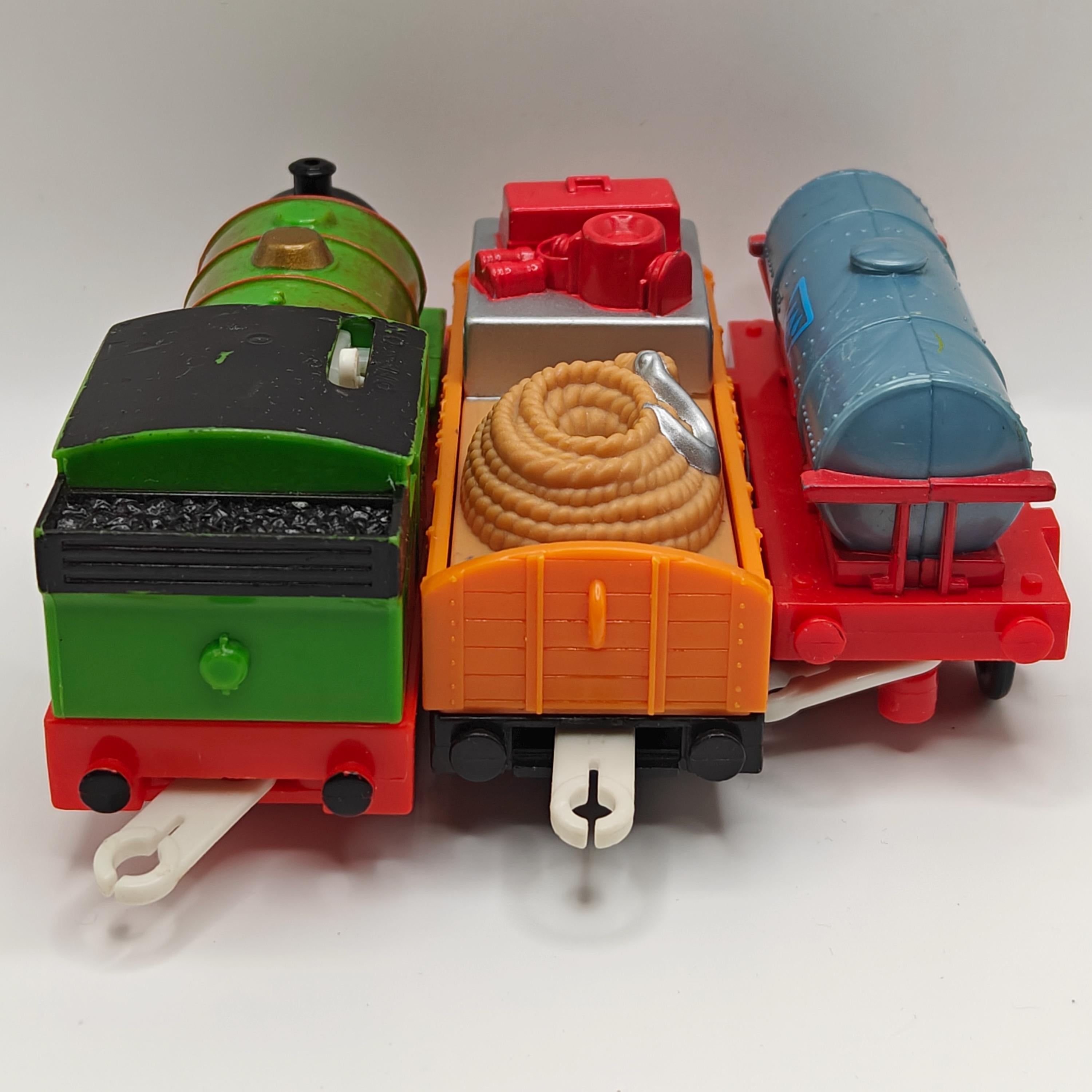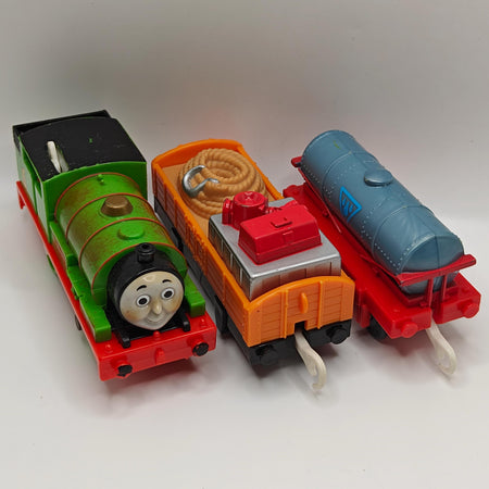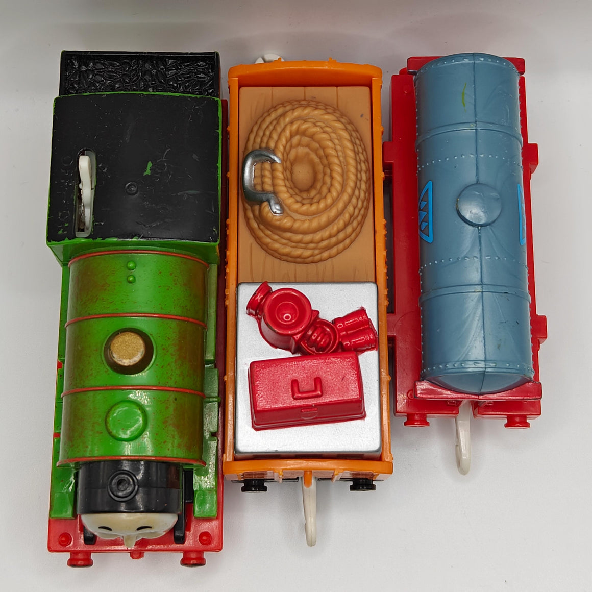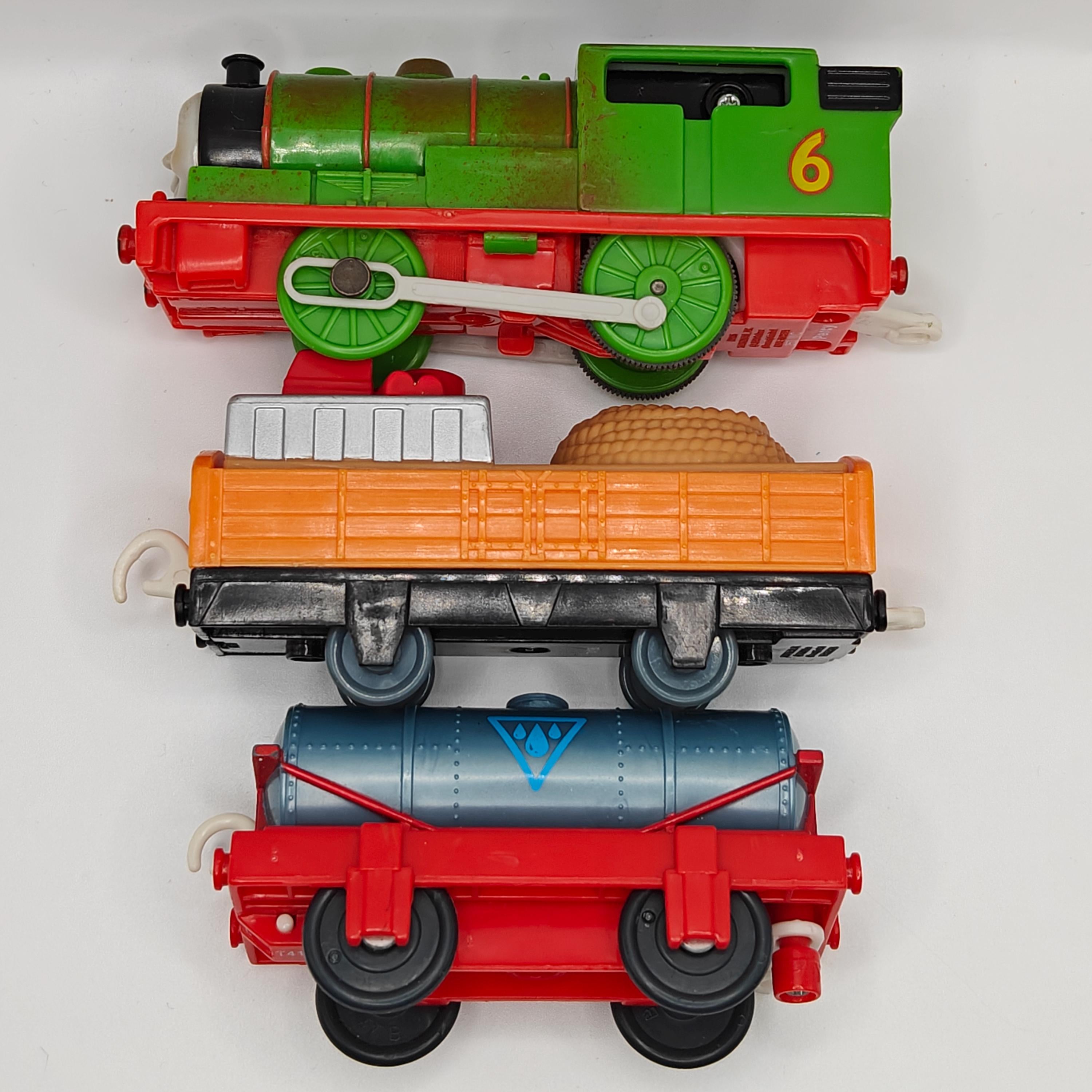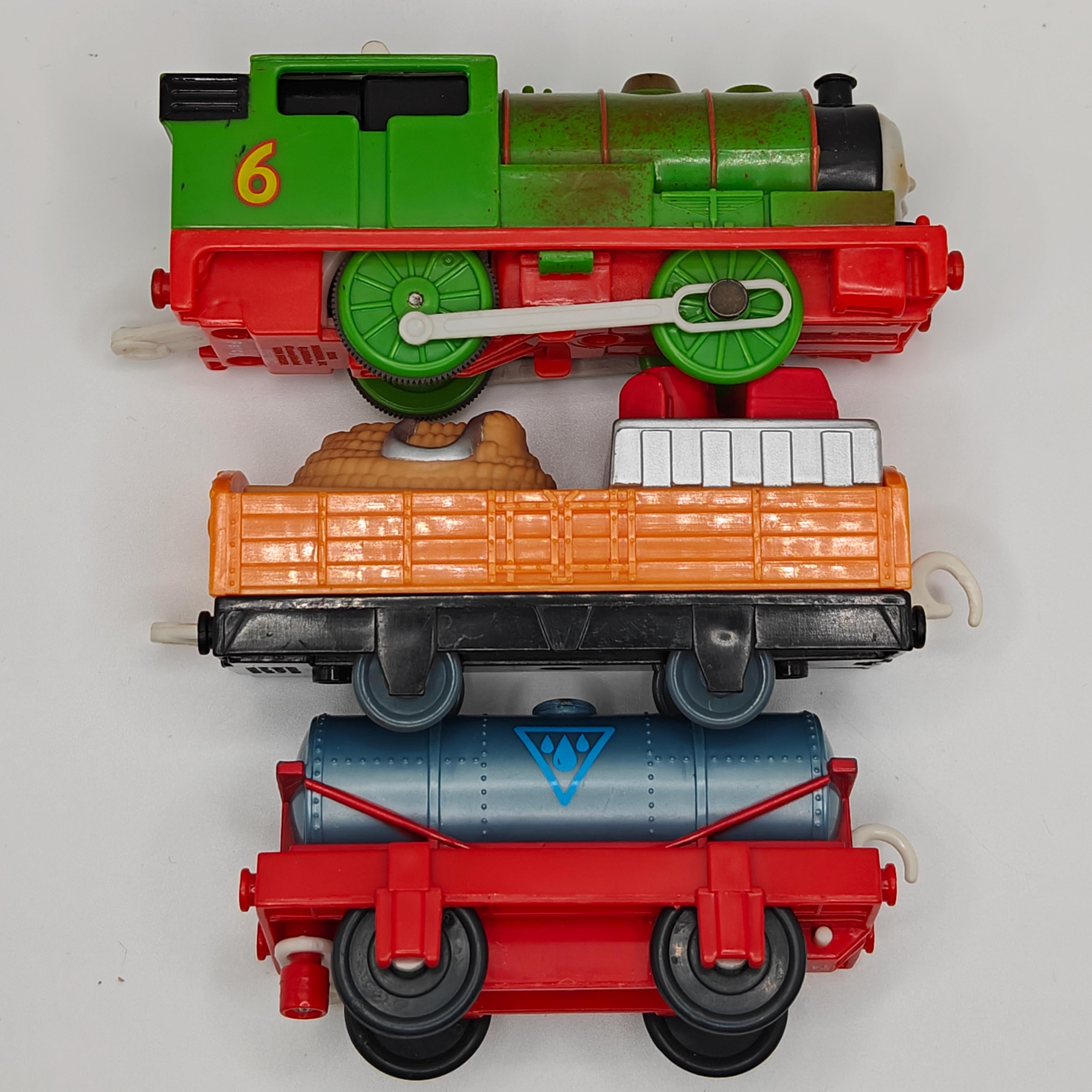 This is a complete Percy and the Search Cars set! Percy is a variant that is covered in dirt, while he come's with a orange wagon with tools in it, as well as a water tanker. This item has been disassembled, cleaned, repaired and tested for full functionality, it is ready for a new owner.