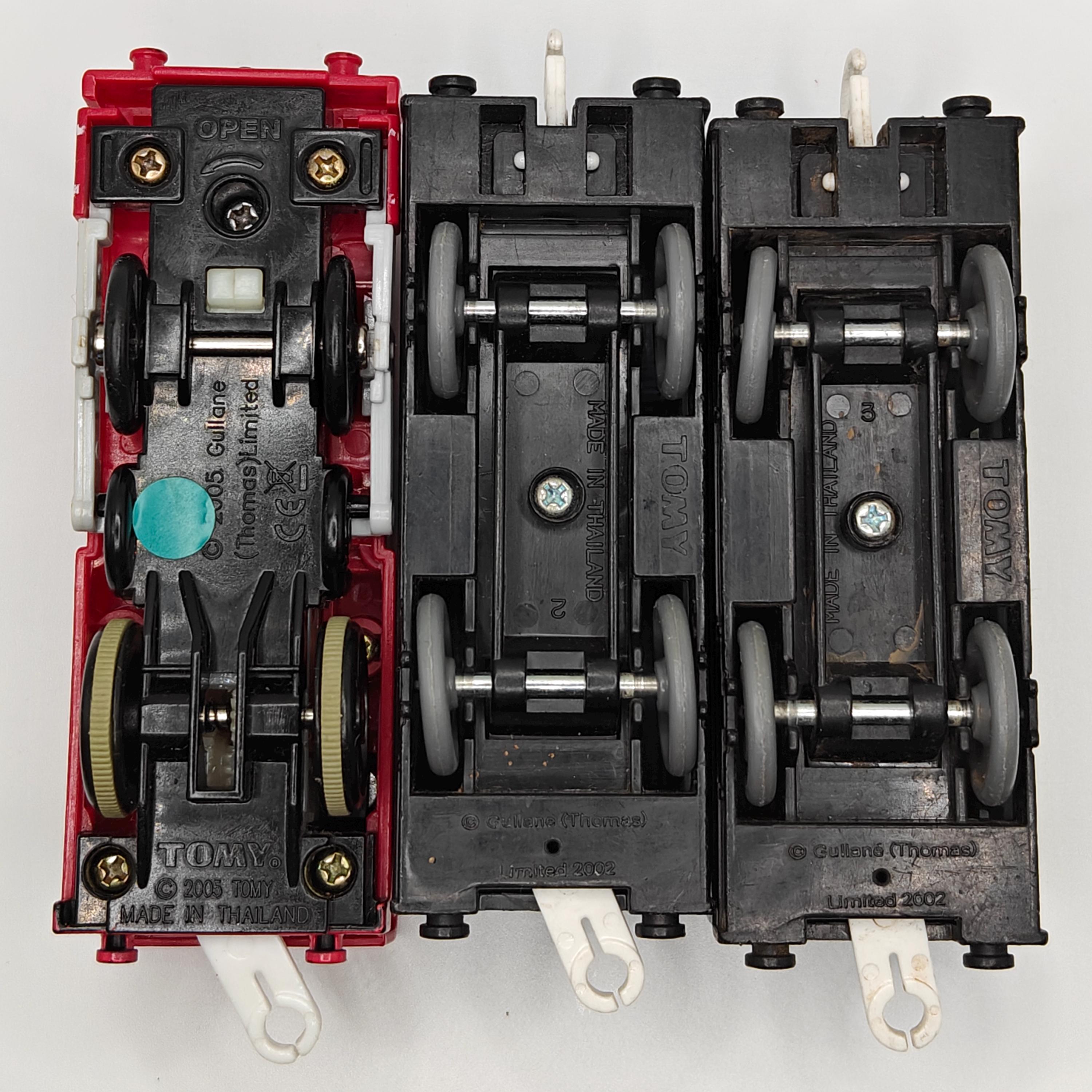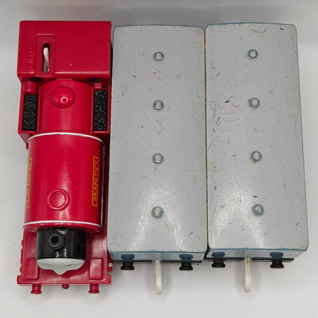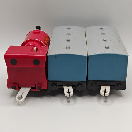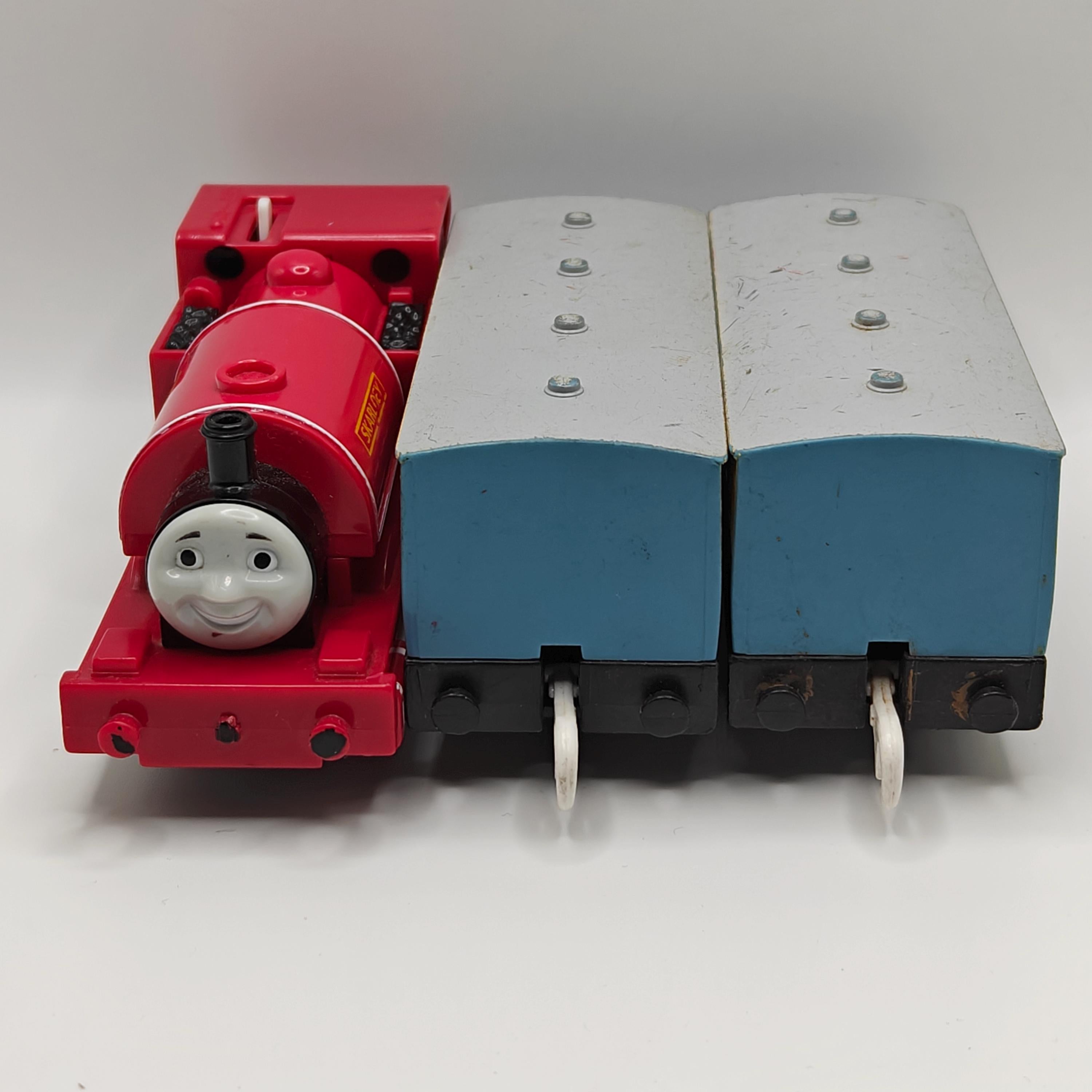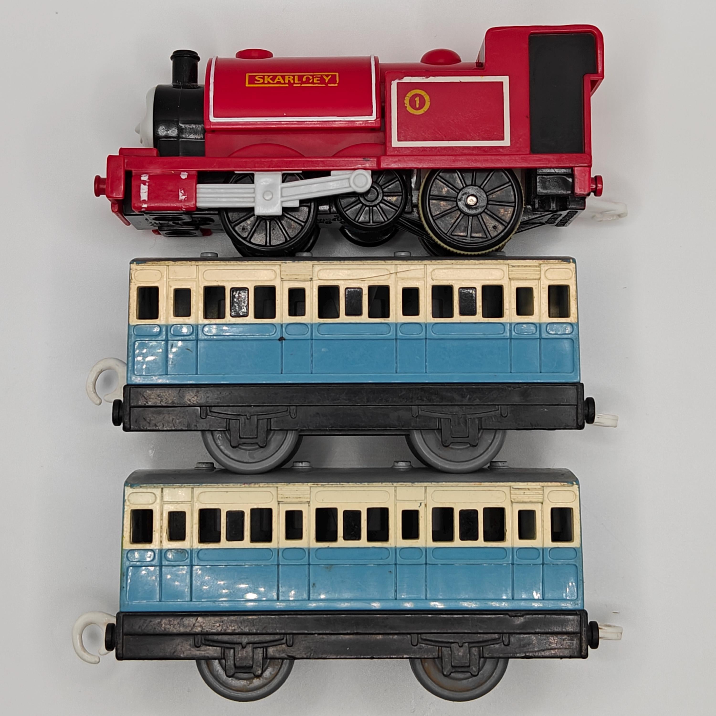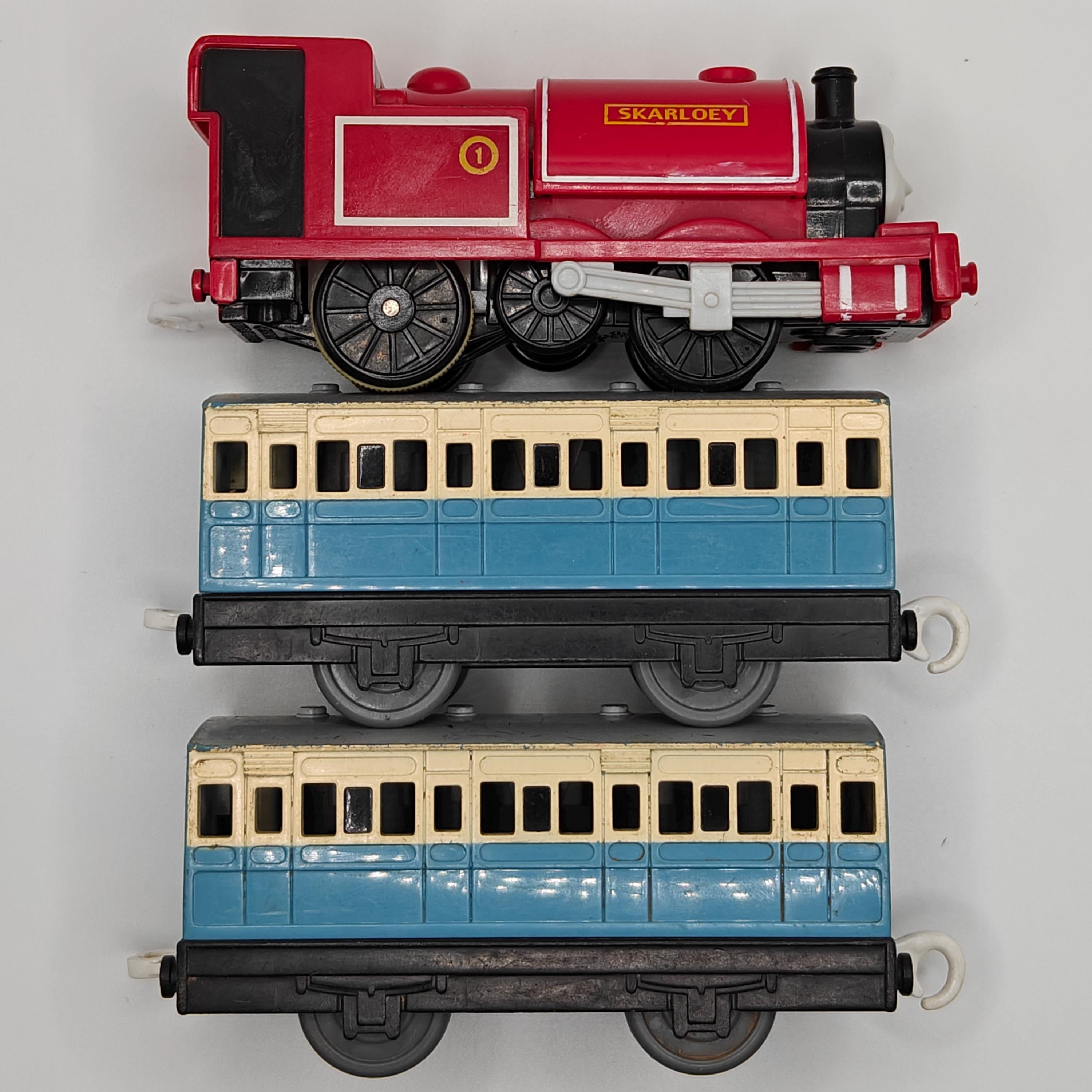 This is a complete Skarloey! He come's with two light blue narrow gauge coaches. This item has been disassembled, cleaned, repaired and tested for full functionality, it is ready for a new owner.