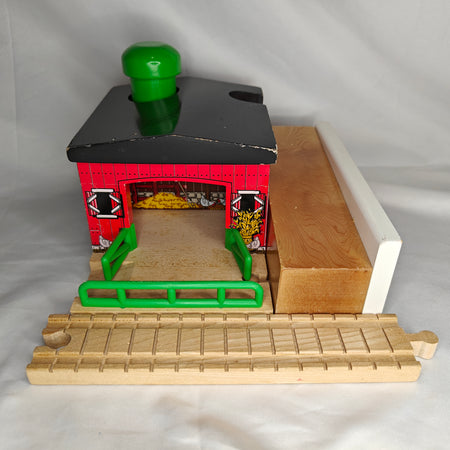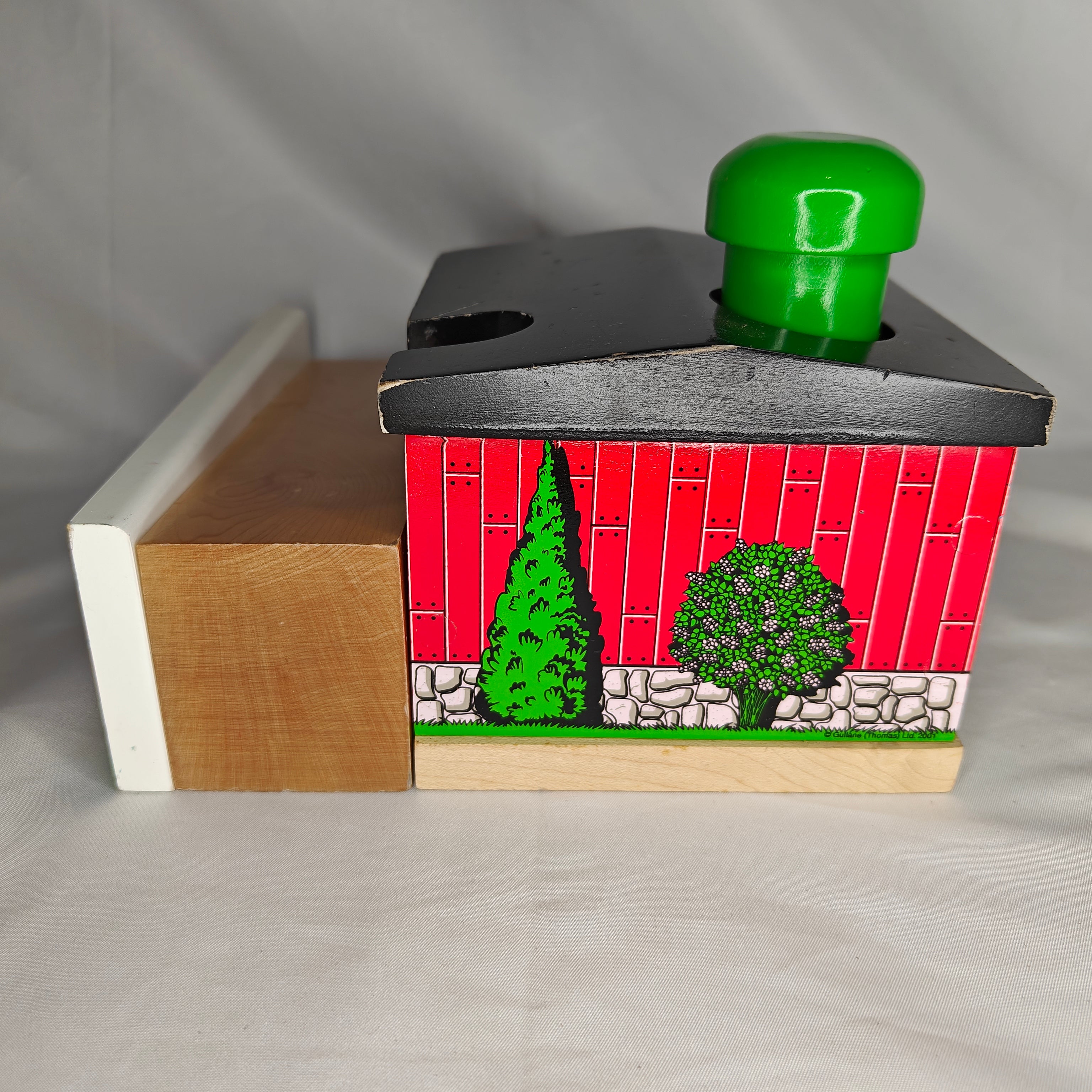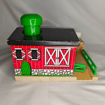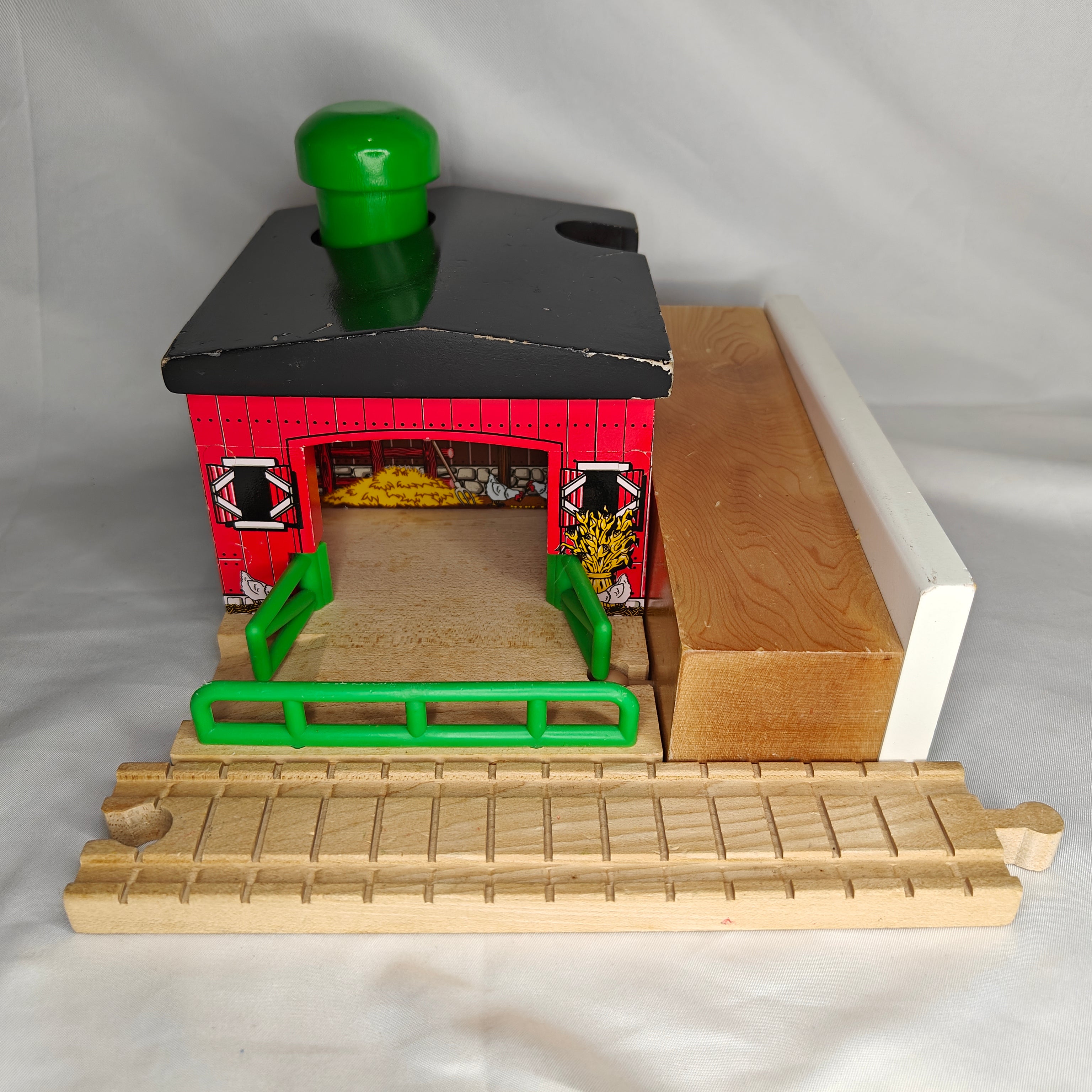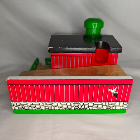 This is a complete Thomas roadway destination! This destination comes with two cows, two barrels of milk, a barrel car, a clickity clack track piece and the destination itself. When pressed, the chimney will chime a bell, and a barrel of milk will pop out and roll onto the awaiting barrel car. Unfortunately, while the destination itself is good overall condition, one of the barrels of milk is not. Buying from this listing you will receive the exact item pictured. Please closely review the photographs to ensure you are happy with their condition before purchasing.