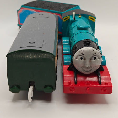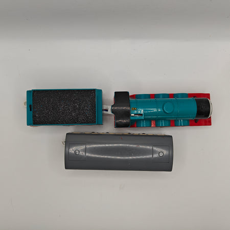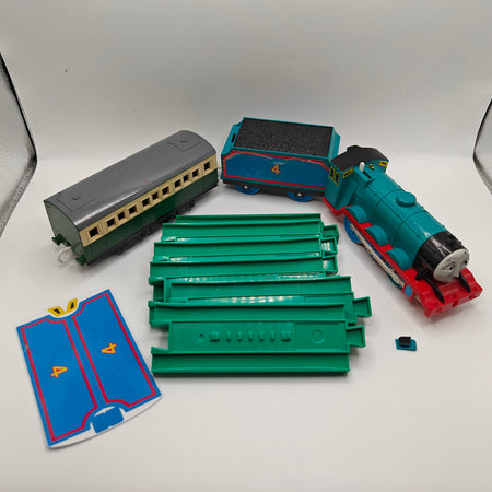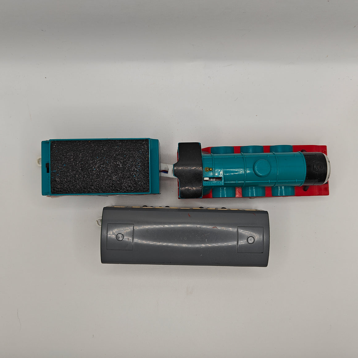 This is a complete Talking Gordon (2000)! This is the first talking Gordon to be released in Japan, and as such it only speaks Japanese. Gordon is in varied condition overall. His tender plastic cover is brittle due to age and may not hold up well if used for play, the rear bumper broke off and will be included should you choose to glue it back on. The stickers on his tender could use a replacement, so a replacement sticker sheet will be included should you choose to use them. He also comes with his green express coach, as well as the original green track pieces that will cause him to say different things when passing over each of them, all six are included. This item has been disassembled, cleaned, repaired and tested for full functionality, it is ready for a new owner.