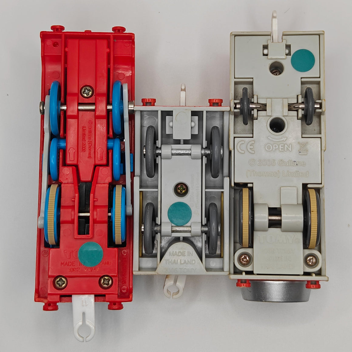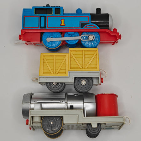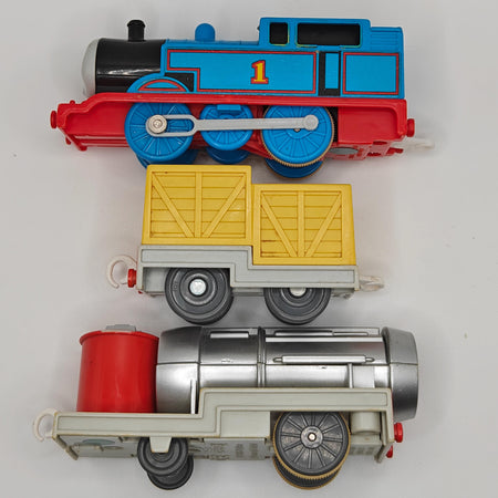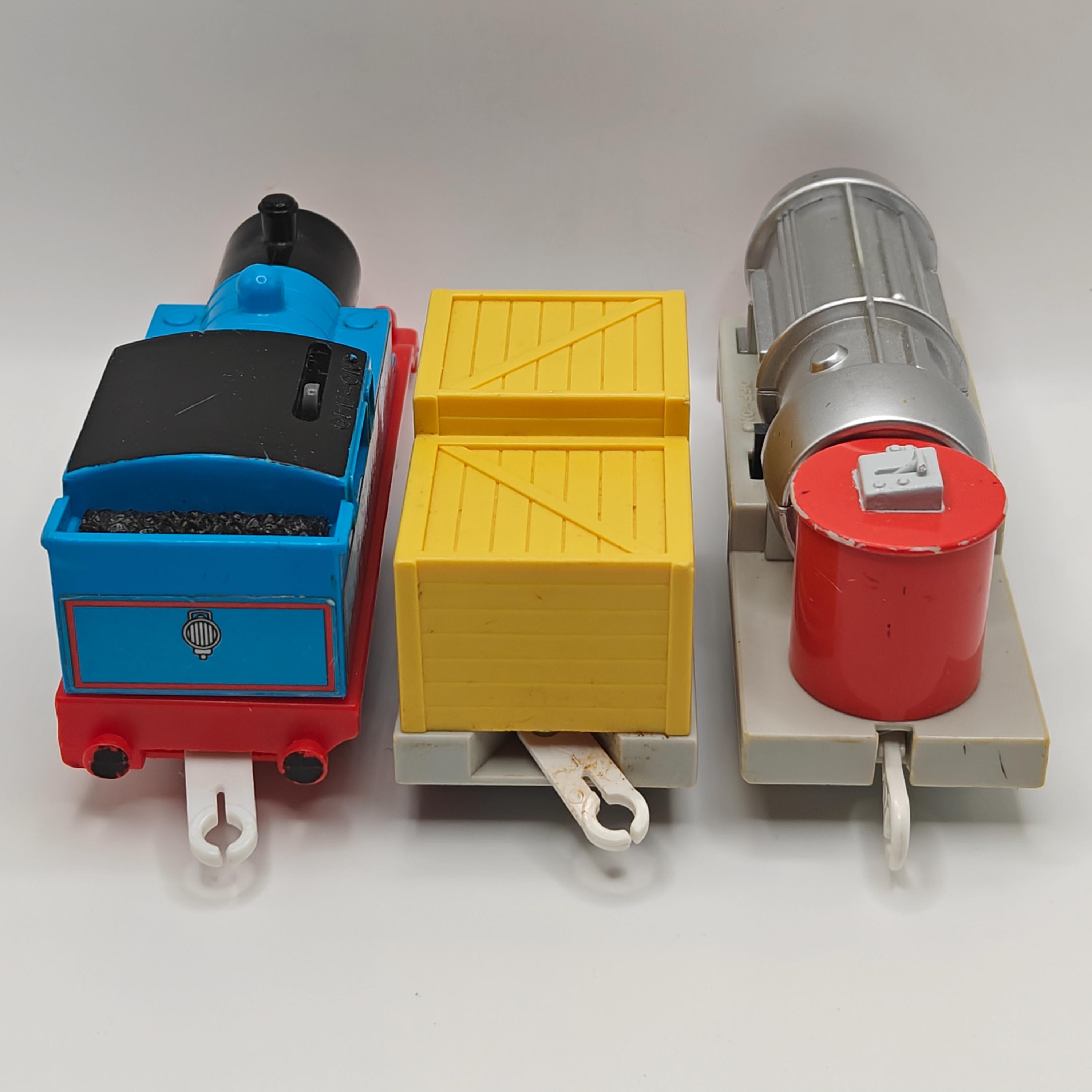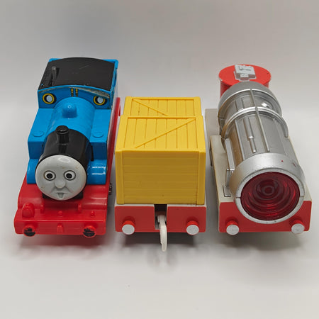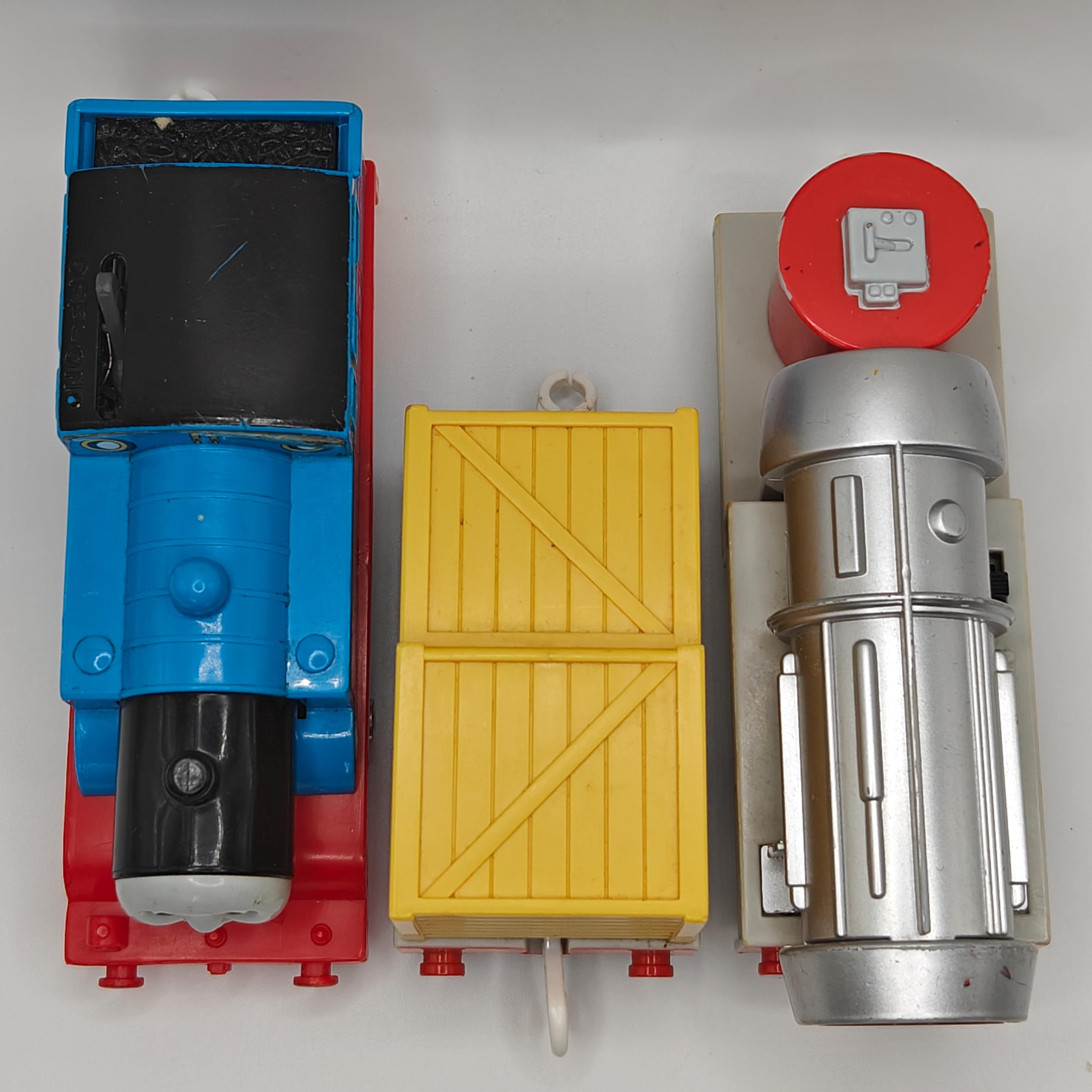 This is a complete Thomas with the jet engine! Thomas features a shocked face, while also including a cargo car, and the titular jet engine. The jet engine needs separate batteries in order to light up as Thomas moves. This item has been disassembled, cleaned, repaired and tested for full functionality, it is ready for a new owner.